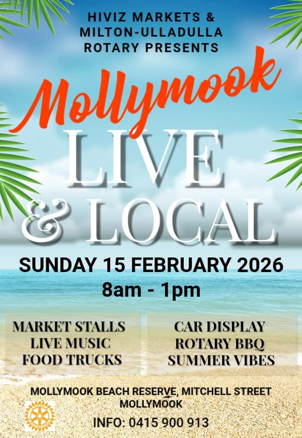 Featured Featured February 15 • 8:00 am - 1:00 pm Mollymook Live & Local Festival Mollymook Beach Mollymook, NSW, Australia Held in one of the best locations in the Shoalhaven, right next to Mollymook Beach, in Mollymook Beach Reserve. This event will be in conjunction with Milton/Ulludulla Rotary, raising funds for local projects and charity groups in the area. This annual Festival will have two sound tents showcasing local artists, food trucks, a range of